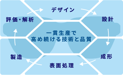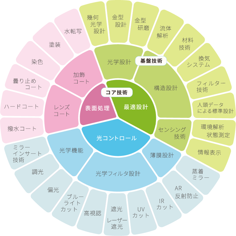 「光コントロール技術」、「表面処理技術」、「最適設計」の3つの技術をコアとし、これらの技術群を自社工場におけるアイウェアの一環生産に結集させ、「安全」と「快適」の質の向上を求め、発展させ続けてきました。