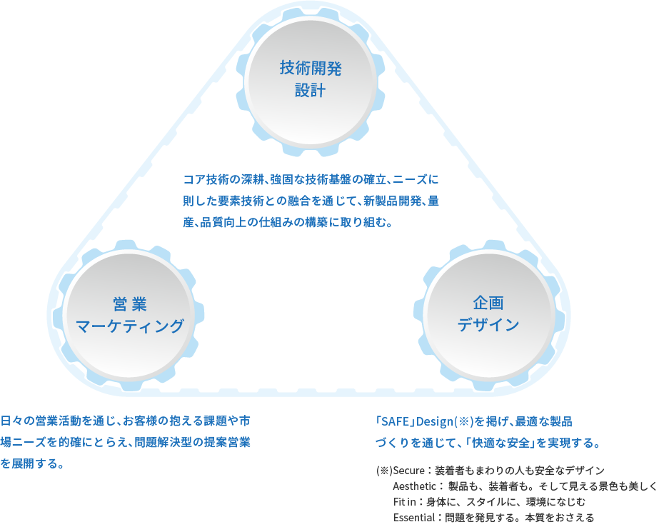 ニーズや技術の価値を正確に捉え、山本光学の総合力でお客様に安全で快適な製品と関連する情報やサービスを提供しています。また、営業/マーケティング、企画/デザインとの強固な連携を通じ、一人一人が創造力、提案力とスピーディーな行動力を発揮することで、社内外の技術の融合による既存事業の最適化と、先端技術の取り込みによる新製品・新規事業の創出に取り組んでいます。